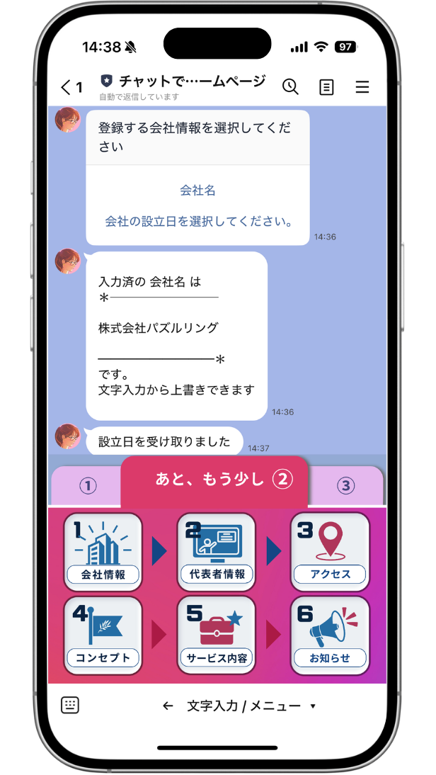 リッチメニューを開き①タブの1〜順に会社情報を入力して送信②タブへ遷移して①タブ同様に1〜順に回答