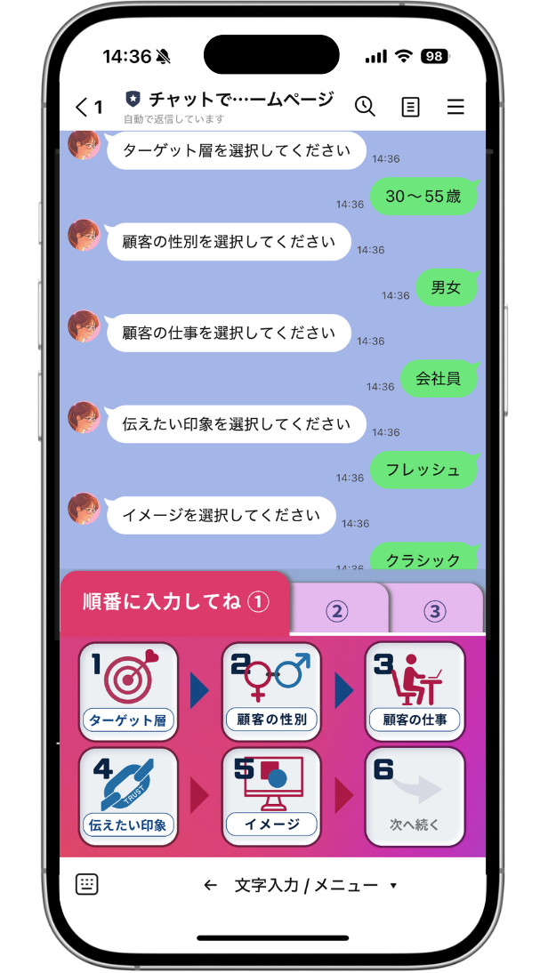 タブ①〜順にチャットするだけ