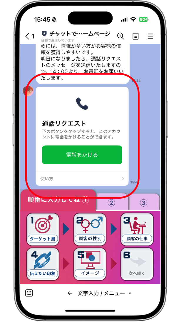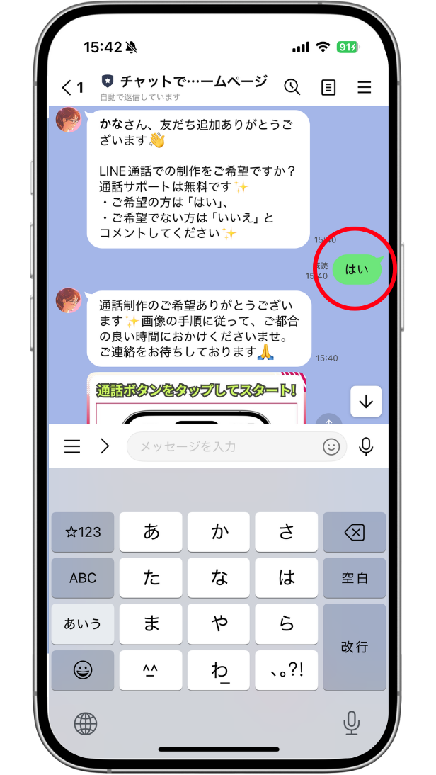 「LINE通話での制作をご希望ですか?」のメッセージに「はい」と回答