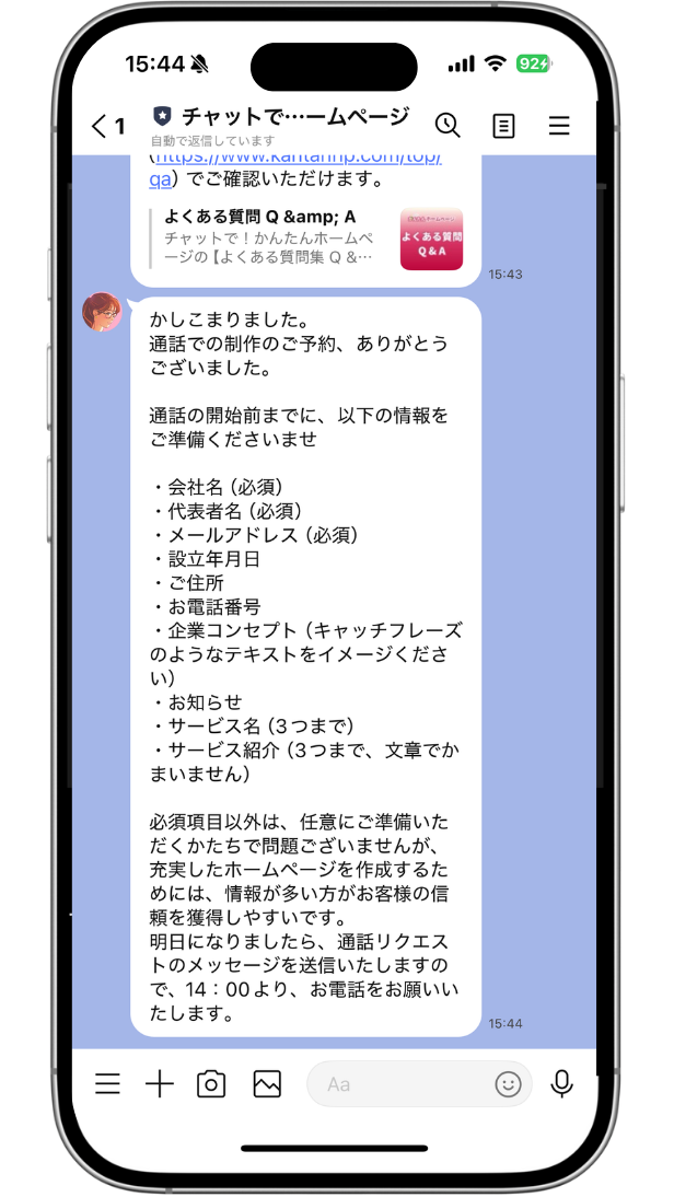 LINE通話でオペレータの質問に答えるだけ!スマートフォンだけで、こんなに簡単にホームページが作れてしまうなんて…時短体験をどうぞ!